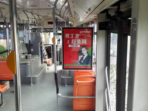 公交车内框架看板广告,作为公交车平面广告的典型代表,采用国际标准海报规格,可视性强,视觉冲击力大。一般设置在后半节车厢扶手架上、司机后面挡板、后部下车左边扶手架上的静态平面广告。公交车框架广告受众多,类型广,而且作为倡导绿色出行的现代社会,公交车乘坐人数还在不断增加,大多为年轻上班族以及学生移动人群。